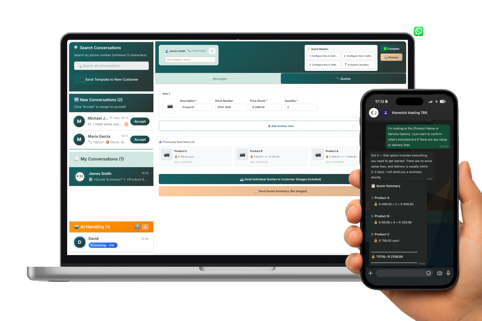 A simple 3-step flow to turn WhatsApp enquiries into organized conversations and professional quotes.